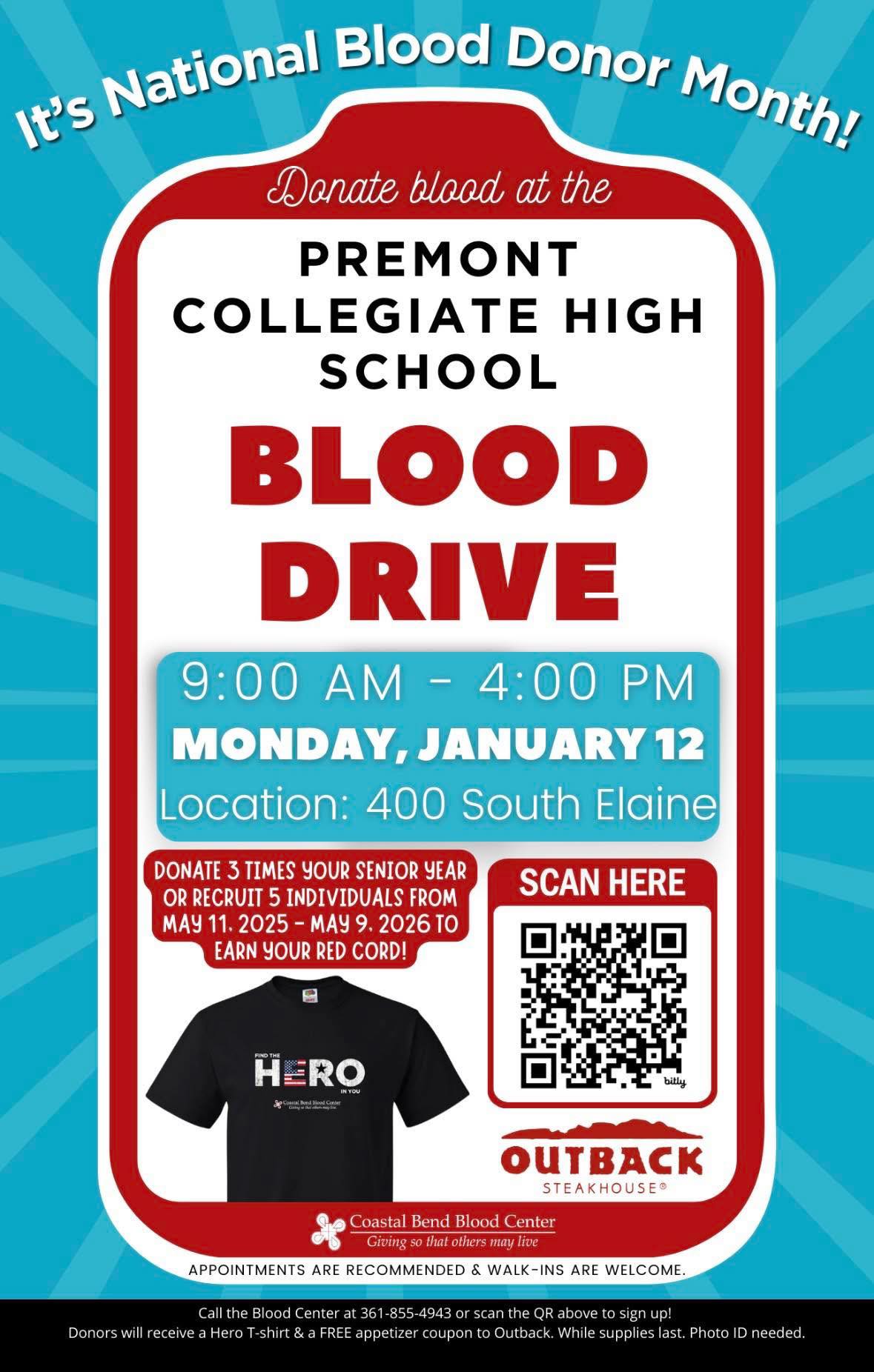 It’s National Blood Donor Month! Premont Collegiate High School is hosting a Blood Drive, and we invite our community to come out and make a life-saving difference! Monday, January 12 9:00 AM...